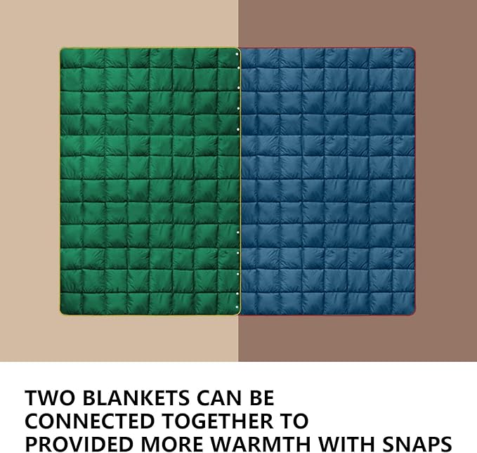 - MATERIALS: Filled with sustainable premium feather down that pass Responsible Down Standards (RDS), the camping blanket is up to standard. Made from 100% nylon, it protects you from stains and bad weather, which is a ideal present for people who adores outdoor activities