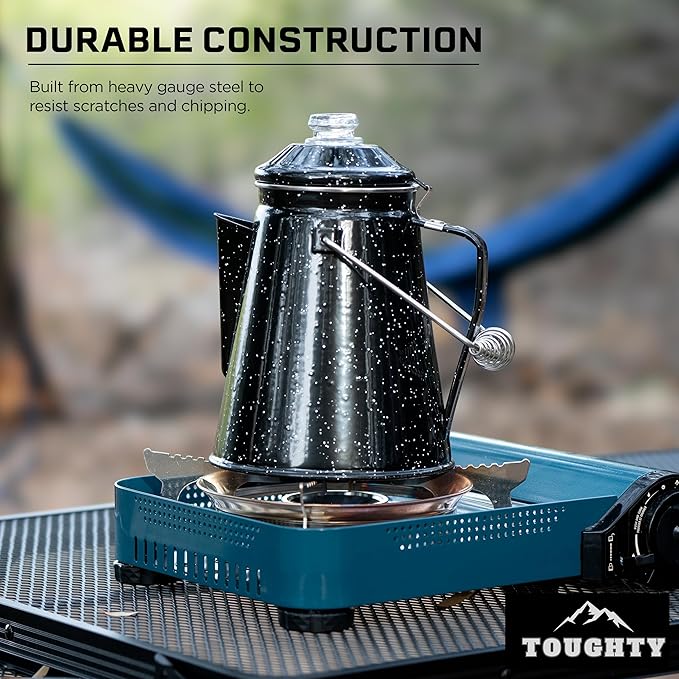- Built to withstand the elements, every piece of the Toughty Coffee Percolator is kiln-hardened twice at 1,000℉, ensuring timeless craftsmanship and durability