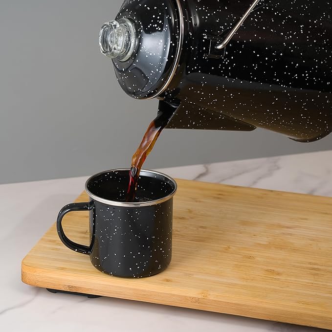 - Complete your adventure percolator with two-12 ounce mugs.Enjoy your brew for any cabin, RV, or even a retro farmhouse kitchen with the coffee pot for camping over fire or stove