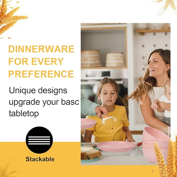 - Durable and Unbreakable: Say goodbye to shattered dinnerware! Our 4-person plastic reusable plates and bowls set are made from wheat straw and plastic—100% BPA-free and tough enough to withstand the clumsiness of even the most enthusiastic eaters.