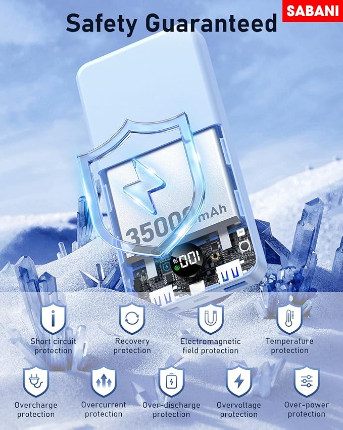 - Safe and Reliable Battery Pack: SABANI portable battery has 10 layers of multiple system protection, built-in low-temperature IC ice core, intelligent monitoring of voltage and current, actively avoid over-charge, over-discharge, short circuit, high temperature and a series of potential dangers, creating a safe charging environment for you. What You Get: 1*35000mAh Portable Charger with 4 built-in Cables and 3 Ports, 1*USB C Cable for Recharging Portable Charger, 1*User Manual.