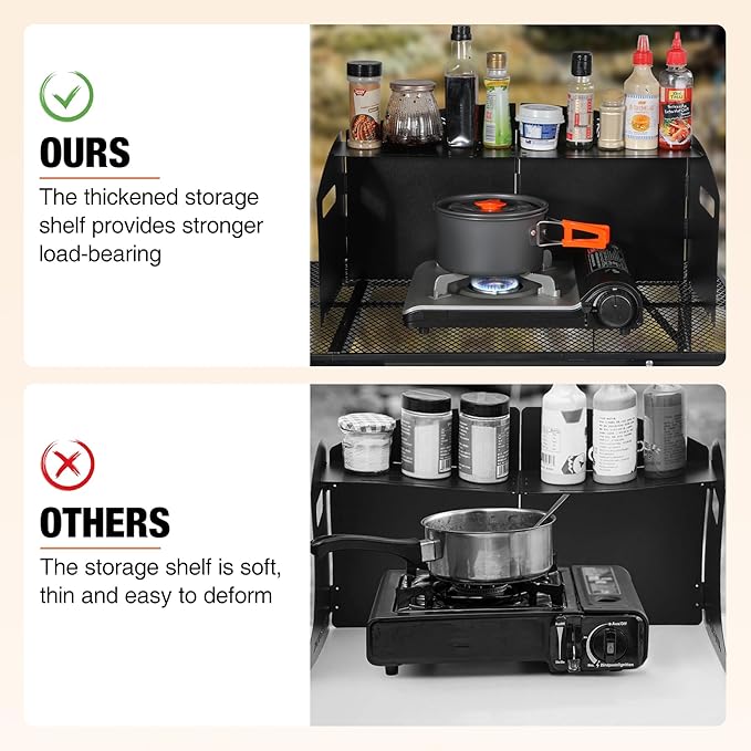 - Thickened 2mm Storage Shelf & 3-Side Buckle Design Features a reinforced 8”x6” shelf (2mm thickness) with triple-side buckles to secure spices, utensils, or small cookware (holds up to 5 lbs). Eliminate clutter and keep essentials within reach during camping, barbecues, or picnics.