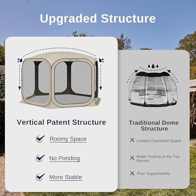 - ๐ฅ๐ผ๐ผ๐บ๐ ๐ฆ๐ฝ๐ฎ๐ฐ๐ฒ and ๐จ๐ฝ๐ด๐ฟ๐ฎ๐ฑ๐ฒ๐ฑ ๐๐ฒ๐๐ถ๐ด๐ป: The top structure is supported by heavy-duty fiberglass, which prevents water from accumulating and delivers more space. The zipper can be used on both sides, and its connection with the tent is upgraded with doulble stitching, making it less likely to tear. The door curtain can befixed to the side for easy access