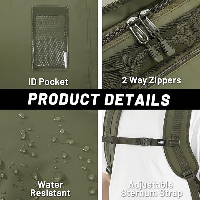 - Functional Construction ---- Daisy chain loops and "D" rings on strap for extra attachments; Innovative compression strap system helps compact large loads; Smooth "MIER" brand zipper and strong buckles, box-stitched on every stress points, being more durable and tough, make MIER bag ready for a lifetime of adventures
