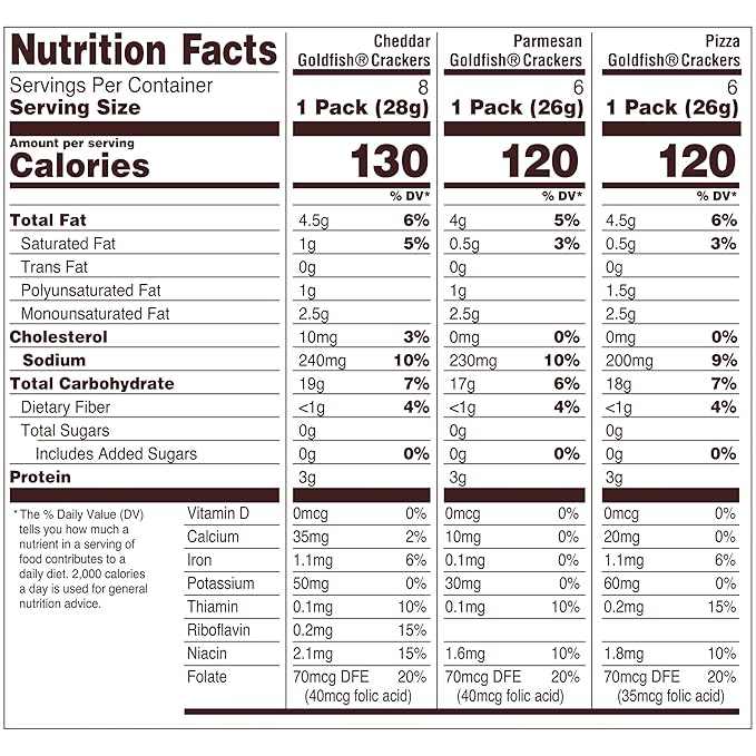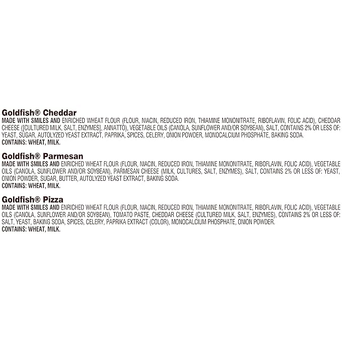 - Variety pack includes: 6 snack packs of Goldfish pizza, 8 packs of Goldfish cheddar, 6 packs of Goldfish parmesan