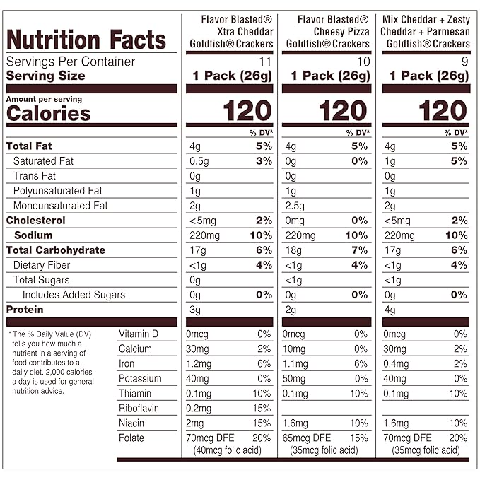 - A cheesy variety: zesty cheddar, flavor blasted xtra cheddar, and flavor blasted cheesy pizza Goldfish crackers