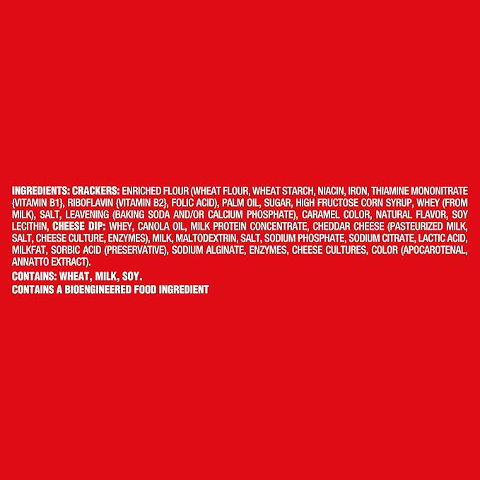 - Individually packaged salted crackers paired with a cheesy dip made with real cheese