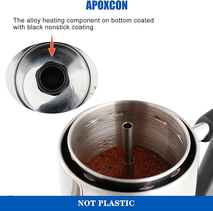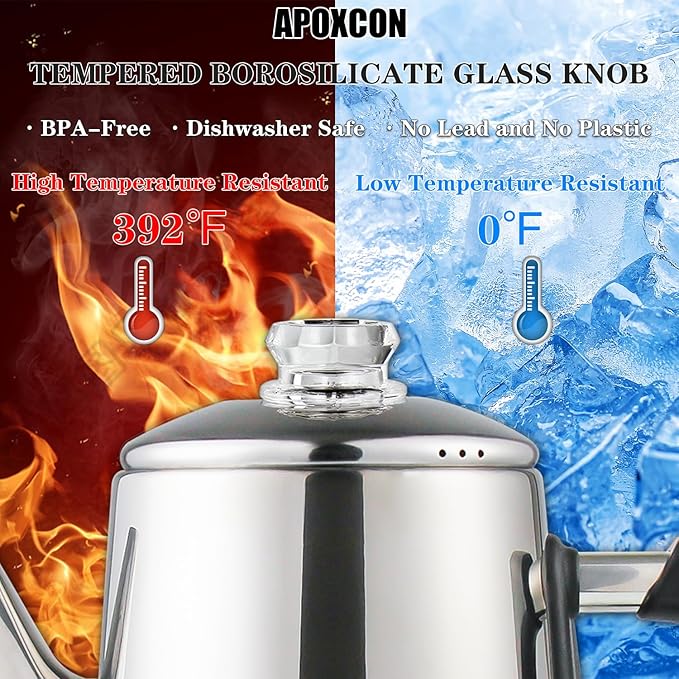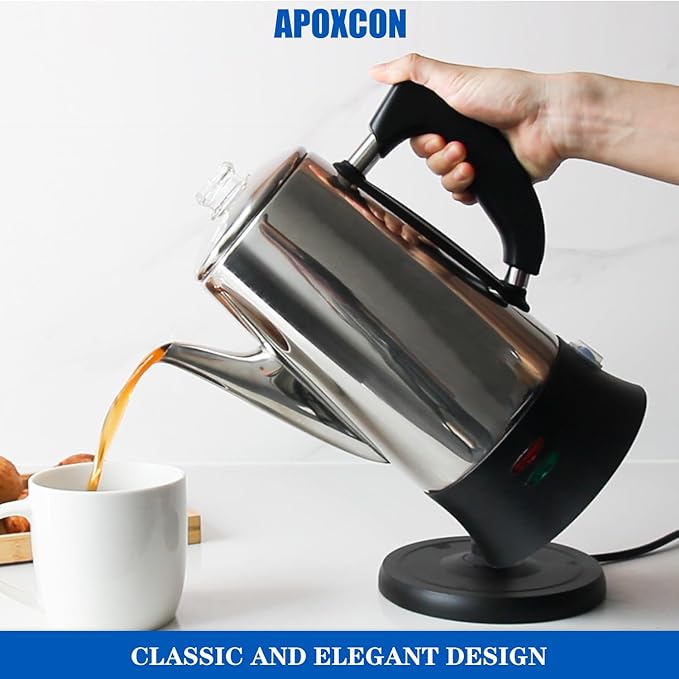 - 【Use Safety】APOXCON electric coffee percolator has passed the ETL certification test, so you can use this coffee percolator with confidence. All parts in contact with coffee are plastic free and aluminum free, providing you and your family with healthy coffee. This percolator coffee pot prioritizes safety during brewing and serving hot coffee.