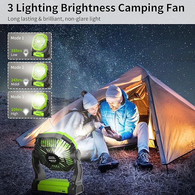 - More Brightness LED Rechargeable Camping Fan with Light- TDLOL portable camping fan has 3 level Brightness modes, the light is soft and not dazzling. The lowest brightness is suitable for night reading, protecting eyesight; The highest brightness can illuminate the entire space, enhance the night experience, and provide an ideal light source for outdoor night activities such as barbecues, picnics, hiking, and fishing.