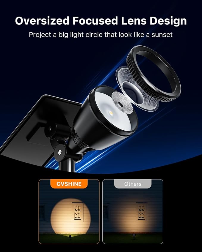 - Focused Beam & Sunset Glow: Solar landscape spotlights are engineered with a high quality oversized round lens light bead, which makes the light more focused, more evenly distributed and clearer boundaries, presenting a illumination effect like sunset light. In addition to that, It also reduces glare and brings you a more comfortable experience when walking at night. Tips: Before first use, please wait at least 12 hours for the product to be activated by direct sunlight.