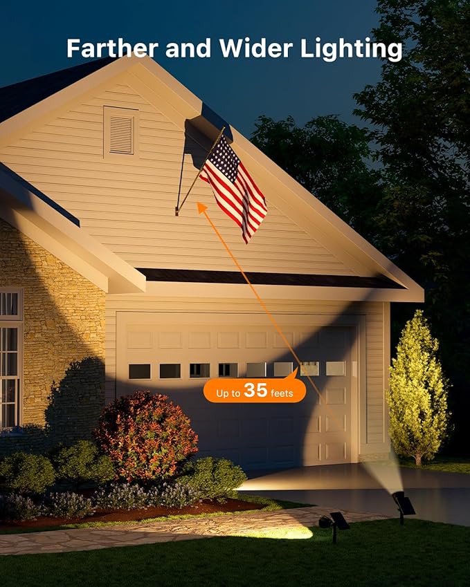 - Farther and Wider Lighting: Solar led floodlight landscape can illuminate up to 35 feet, greatly improving visibility in areas such as yard, garden and houses, ensuring the safety of your nighttime activities. Depending on the mounting location, it can project an aperture from 2 to 20 feet in diameter, fully lighting large objects such as statues, trees, and casting sharp shadows for a unique light and shadow effect.