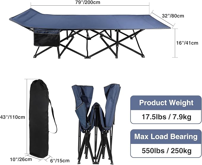 - 32" Extra Wide Comfortable Sleeping Cot: The opening size of this camping cot is 79”Lx32”Wx16"H. Compared with other 26” sleeping cots, our 32” extra wide camping cot allows you to sleep more better even if you are a side sleeper. Create more space to turn freely while lying on it.