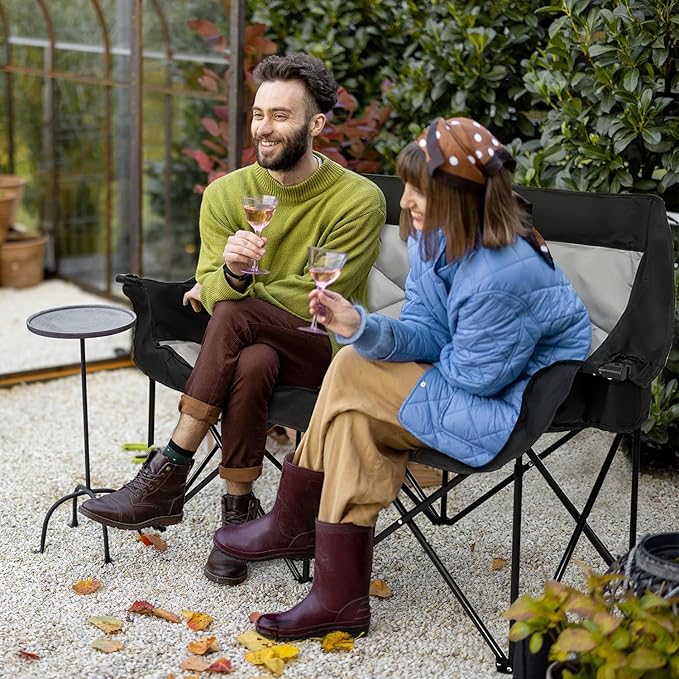 - 【Comfortable Camping Loveseat】The loveseat camping chair is made of 600D oxford fabric and durable steel frame construction which add front vertical stabilising legs for more support. Supports 650 lbs. Great for couples!