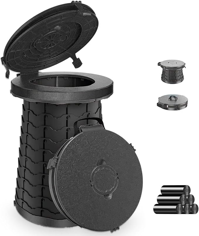 - 【Easy to Use】The camping toilet is designed for quick and effortless setup. To open it, simply pull and twist counterclockwise, and it will be ready for use in just seconds. Its foldable design, combined with a carrying strap, makes it extremely convenient for storage and transport. This ease of assembly and portability makes the portable camping toilet an ideal solution for outdoor activities, camping trips, or emergency situations where traditional facilities are not available.