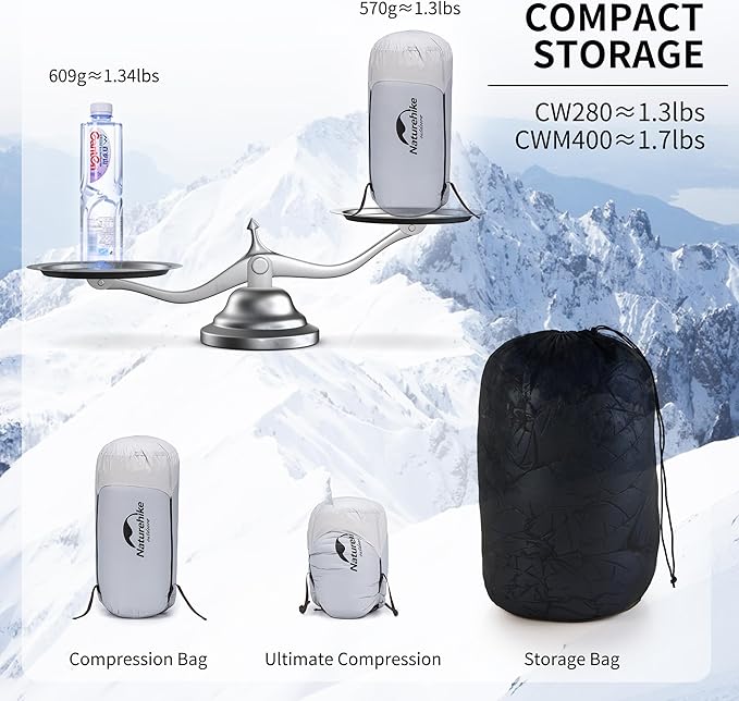 - ULTRALIGHT BACKPACKING SLEEPING BAG - CWM400 weighs only 1.74 lbs/790g, which is about the same weight as a bottle of water. Stowed size: Φ6.3"*13.7 "L/16*35cm, you can even remove the sleeping bag organizer from the backpack with one hand. The lightweight and compact design allows you to take the sleeping bag anywhere you want to go and lie down in the grassland/mountain/desert to see the beautiful starry sky
