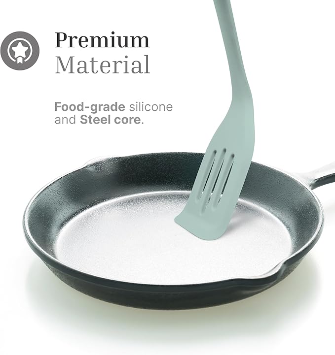 - Premium Material: Our turner spatula is crafted from food-grade silicone and it features steel core ensuring durability and sturdiness; this solid construction enhances longevity and stability, making these slotted spatulas reliable tools for various culinary tasks