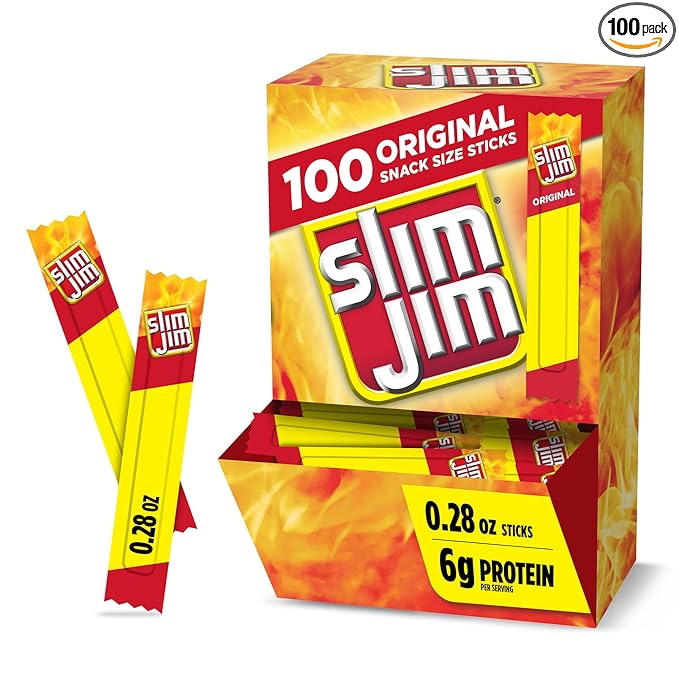 - One 100-count box of 0.28 oz. Slim Jim Original Snack Size Smoked Meat Sticks