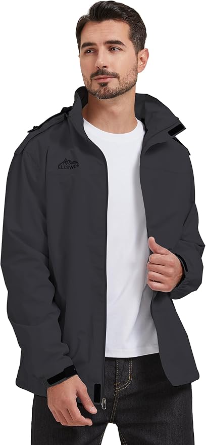 ELLSWOS Men's Waterproof Raincoat Lightweight Rain Jacket with Detachable Hood Softshell Windbreakerl for Hiking Travel