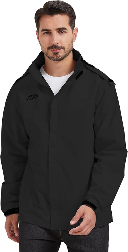 ELLSWOS Men's Waterproof Raincoat Lightweight Rain Jacket with Detachable Hood Softshell Windbreakerl for Hiking Travel