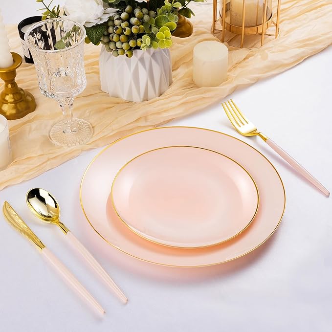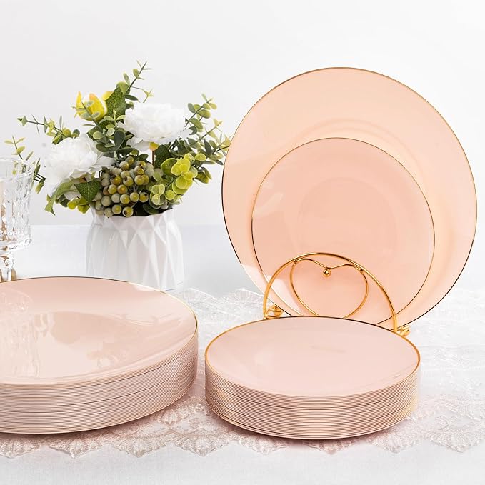 - VALUE PACK: Our pink disposable plates for party include 50 dinner plates measuring 10.25 inches and 50 salad plates measuring 7.5 inches, which can accommodate the dining needs of 50 people at once. Just spend more time with your family and friends with our pink and gold plastic plate set!