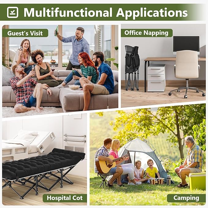 - 【Comfort】Camp cots are typically used for short-term purposes, come equipped with suitable mattresses and support structures, friends visiting can be used as a temporary sleeping bed to ensure users have a good sleep experience.