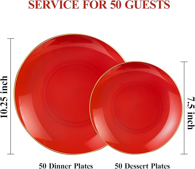 - VALUE PACK: Our red disposable plates for party include 50 dinner plates measuring 10.25 inches and 50 salad plates measuring 7.5 inches, which can accommodate the dining needs of 50 people at once. Just spend more time with your family and friends with our red and gold plastic plate set!
