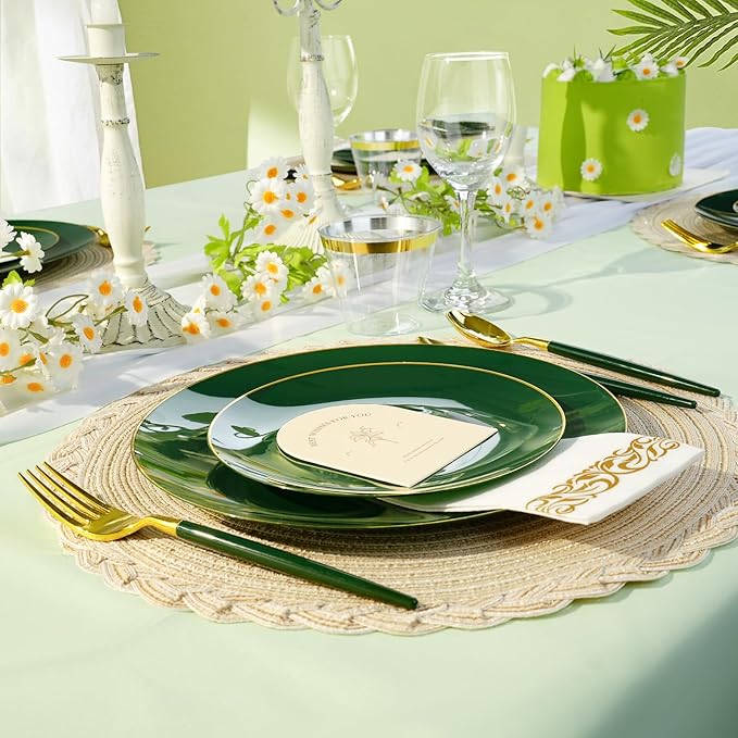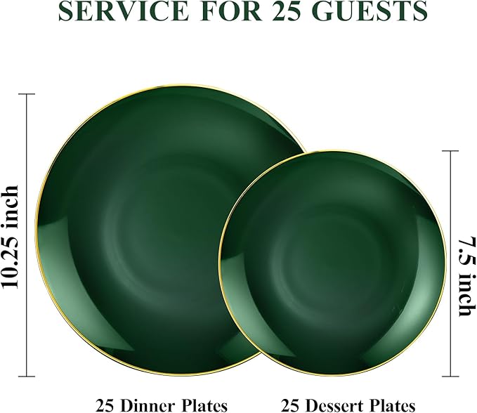 - VALUE PACK: Our green disposable plates for party include 25 dinner plates measuring 10.25 inches and 25 salad plates measuring 7.5 inches, which can accommodate the dining needs of 25 people at once. Just spend more time with your family and friends with our green and gold plastic plate set!