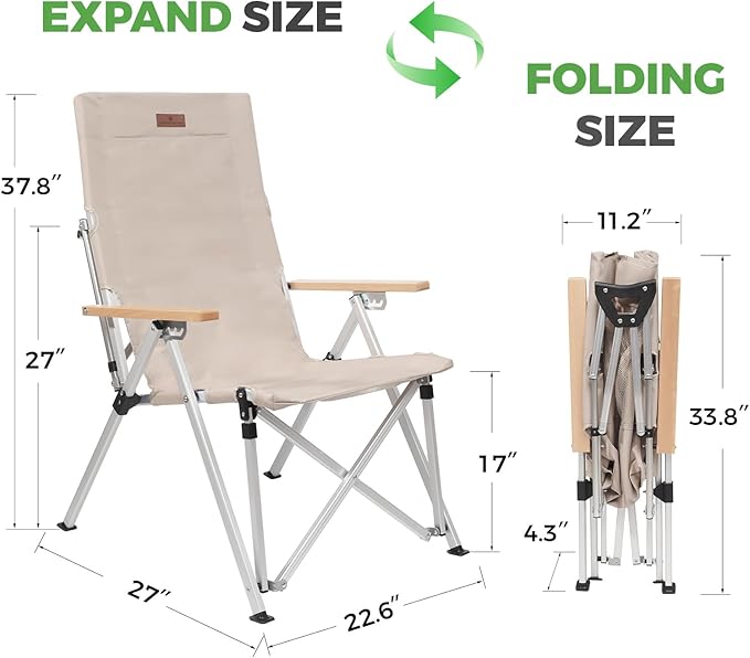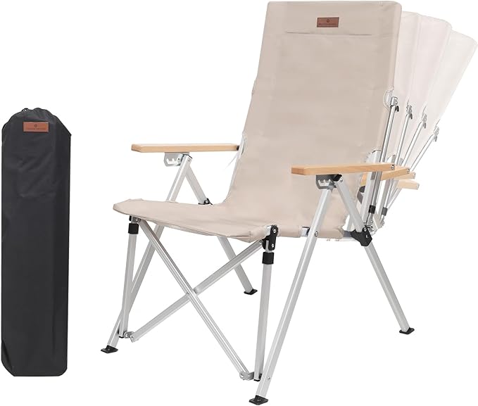 - FUNCTIONAL ARMREST: The reclining camping chair tilts the backrest angle by switching the armrest gear. Four gears can be easily and quickly switched, with gears 1 and 2 suitable for sitting, and gears 3 and 4 suitable for lying down. The armrest is made of beech wood, which provides a sense of quality and comfortable sitting experience. Switching between sitting positions allows you to have both a regular and high back camping chair at the same time.
