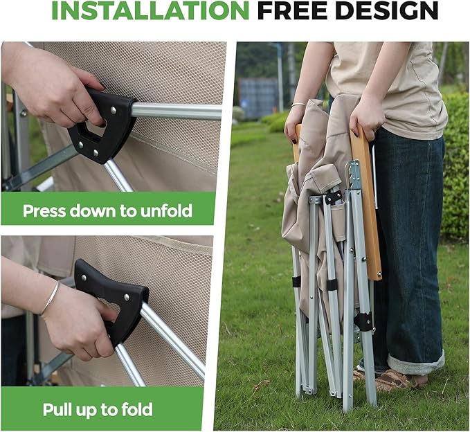 - PORTABLE&INSTALLATION FREE: Unlike traditional folding chairs, our compact camping chair eliminate the complicated installation steps and adopt a quick opening bracket design, allowing for easy and efficient camping experience, making travel easier and more comfortable. When not in use, it can be folded into smaller sizes for easy storage and transportation. The best part is that this outdoor chair with a storage bag for easy carrying.