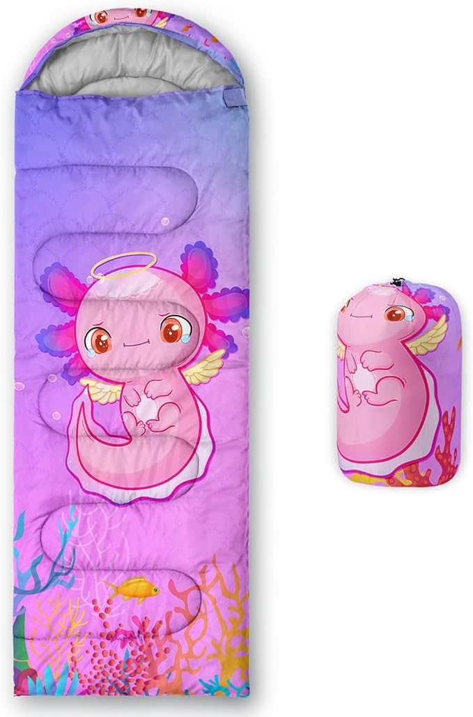 - 【Fashion Design】This sleeping bag is printed with a cute pink axolotl pattern,which suitable for outdoor camping for your children.This ocean themed warm sleeping bag is suitable for children who love the ocean,waterproof and lightweight.