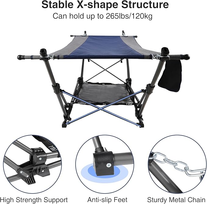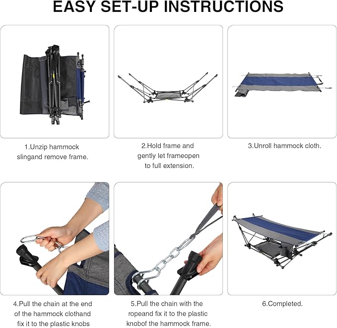 - Sturdy and Stable: Constructed with a heavy-duty powder-coated steel frame, this standalone hammock ensures stability and durability. Features anti-slip feet and safety fixtures to prevent tipping.