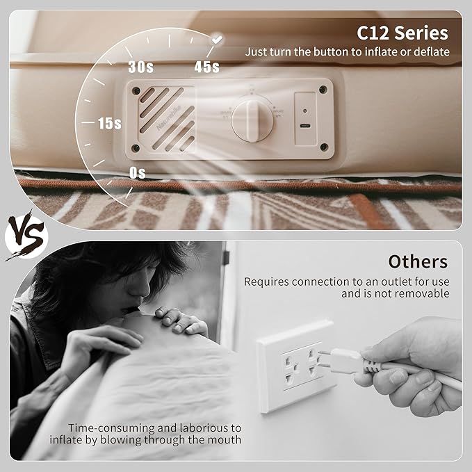 - BUILT-IN ELECTRIC PUMP FOR FAST INFLATION: Foam filling allows the air cushion to slowly self-inflate to 80% status with the valve open. Meanwhile, our air mattress has a built-in 45,000rpm electric pump that can inflate or deflate in 45 seconds. The knob turns right to inflate and left to pump, making it easy to operate. 4000mha battery capacity allows the pump to be used 10-12 times when fully charged