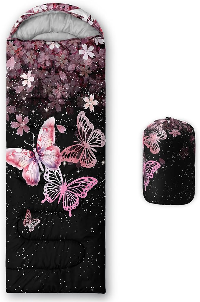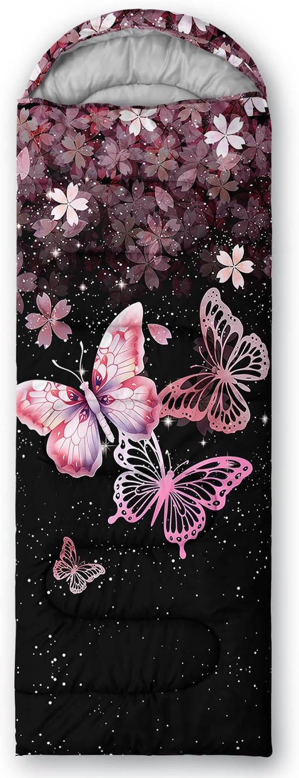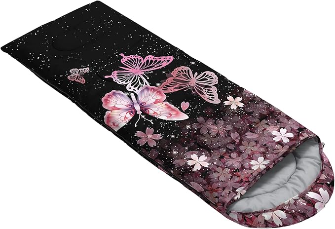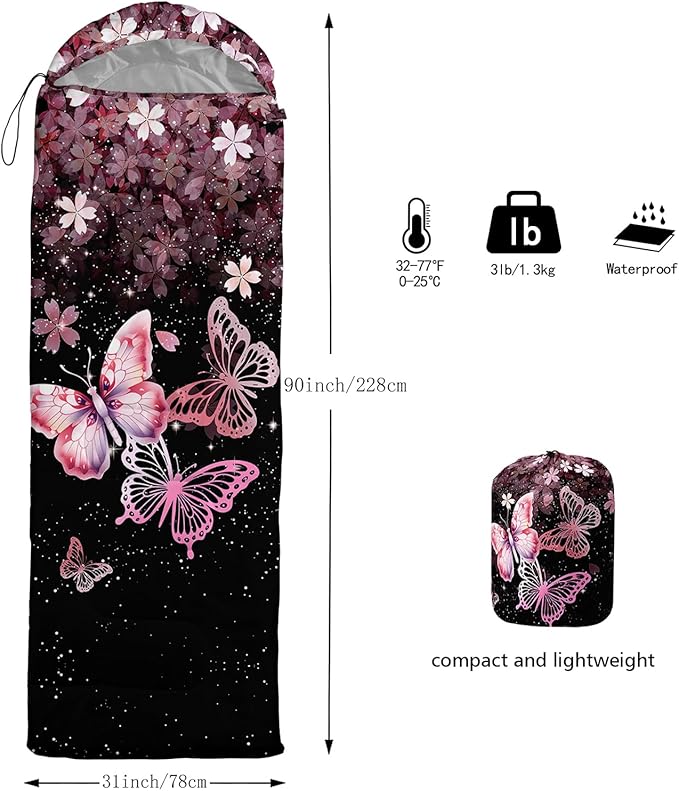 - 【Fits For 3 Seasons】: Size - 31 by 90 inches (W x D). Our Pink Butterfly sleeping bag can be used in 3 seasons with a design temperature of 32℉-77℉(0℃-25℃). These Sleeping bags also have a weather resistant waterproof design to keep you warm and prevent you from any dampness.
