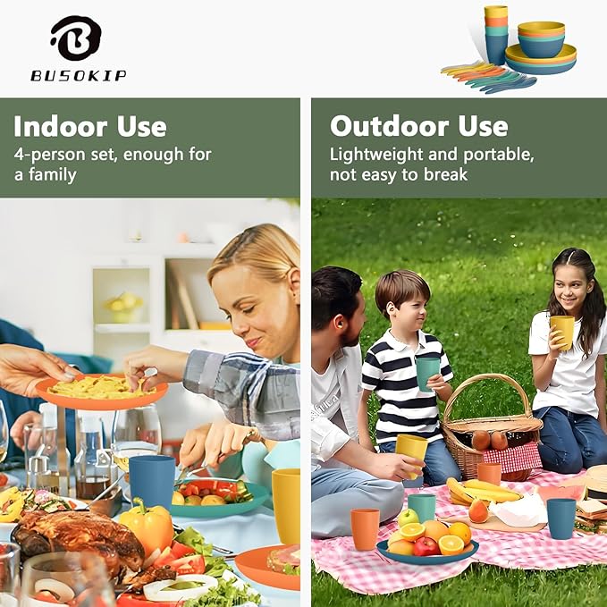 - VERSATILE DISH SET: This complete wheat straw dinnerware set is perfectly portioned for a family of four, including everything you need: four dinner plates, four bowls, four cups, and four sets of forks and spoons. It’s your all-in-one solution for effortless meals at home, also camper essentials for life on the road, making it ideal for busy weeknights, casual dinners with friends, or even as a dedicated dinnerware set for your RV or vacation home
