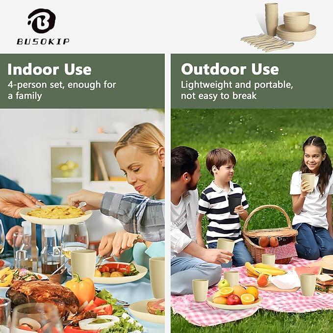 - SERVICE FOR 4: BUSOKIP 20 pieces wheat straw plates and bowls sets include 4 plates, bowls, cups, forks and spoons. The color is black. The dishes set is suitable for the dining need of 4 people. A simple but compact dinnerware set great for everyday meals at home, school, office, camping or traveling