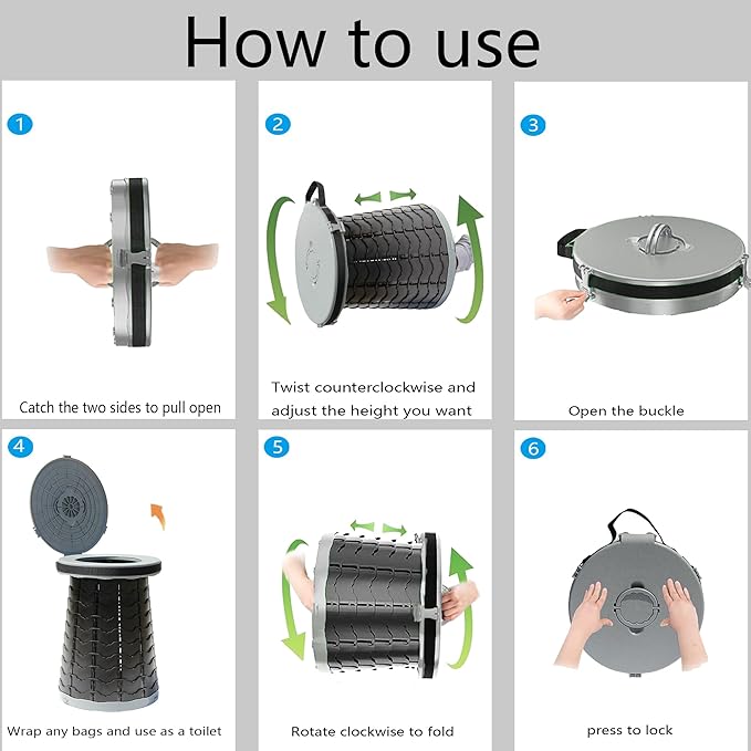 - 【Easy to Use & Clean】This camping toilet only needs to twist and pull to quickly and easily install and fold, and the material is easy to clean and can be directly scrubbed. It comes with a Carrying bag and a trash bag, so you can keep it clean and hygienic wherever you go, making it an ideal solution for outdoor activities, camping trips, or emergencies that traditional facilities cannot provide.