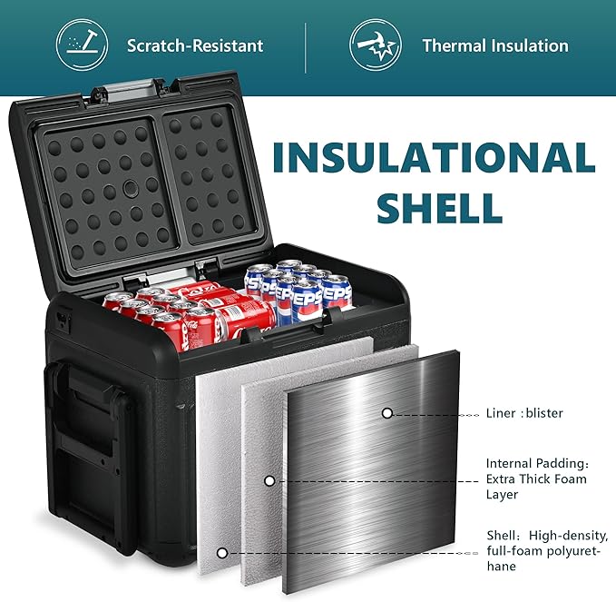 - Humanized Design & Portable Design; The electric cooler for camping features reinforced handles and off-road wheels, making it easy to transport. The user-friendly LED panel with clear buttons allows you to adjust the temperature range at any time. This 12 volt cooler is designed with shock-resistant technology, ensuring it functions properly even on rough slopes up to 40 degrees