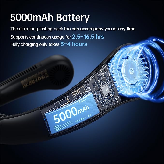- 2.5-16.5 Running Hrs & USB Charging: This rechargeable neck fan, equipped with a high-capacity 5000mAh battery, delivers 2.5 - 16.5 hours of runtime, depending on the speed setting. The neck cooler fan takes 3 - 4 hours to fully charge via USB Type-C, and you can use it while charging