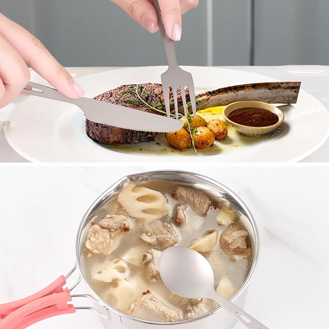 - 【Easy to Clean】 Titanium material is extremely stable and has a high melting point, so this set of titanium camping cookware is resistant to high temperatures, very easy to clean after use, and also supports dishwasher safe. They are healthy camping tableware, odorless and tasteless. The titanium cutlery set is much better than any plastic/wooden cutlery set or stainless steel cutlery set and is lightweight and portable.