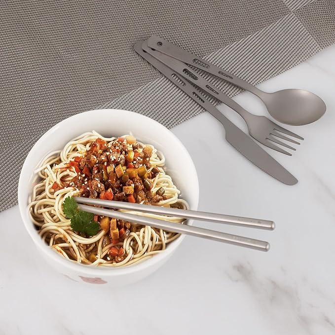 - Included Components : 1 * Pure Titanium Knife and 1* Pure Titanium Fork and 1*Pure Titanium Spoon and 1*Pure Titanium Chopsticks 1 * Pure Titanium Knife and 1* Pure Titanium Fork and 1*Pure Titanium Spoon and 1*Pure Titanium Chopsticks