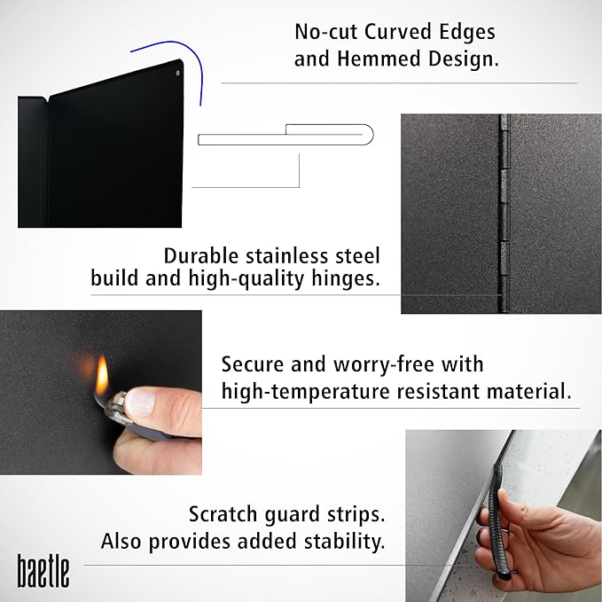 - [PROTECT YOUR BACKSPLASH]: Baetle's 2-piece stainless steel splatter guard set offers comprehensive coverage to shield your kitchen from oil splatters, grease, and mess. Each piece measures 40 x 40 cm and can be used individually or together for versatile protection.
