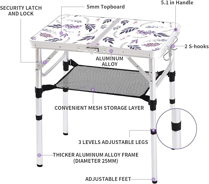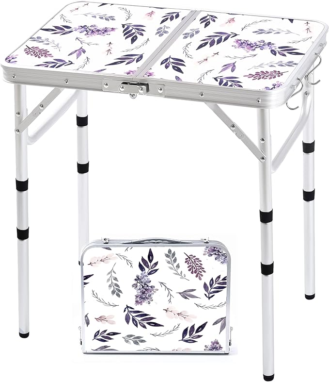 Folding Camping Table 2ft Portable Pinic Table Adjustable Height Small Card Table Aluminum Foldable Lightweight with Carry Handle for Outdoor Indoor Hiking Camp BBQ Beach (Misty Lilac)