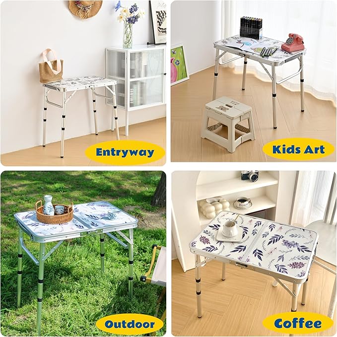 - Adjustable Heights:This small portable table open size is :24 "x 16 ", Adjustable legs offer 3 heights: 10 ", 19 ", 24 ". Folded size is 16 "x12 "x3 " when folded in half. Easily adapt the table to your needs and enjoy the flexibility it provides