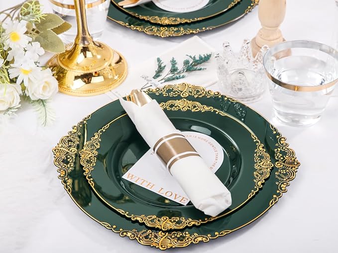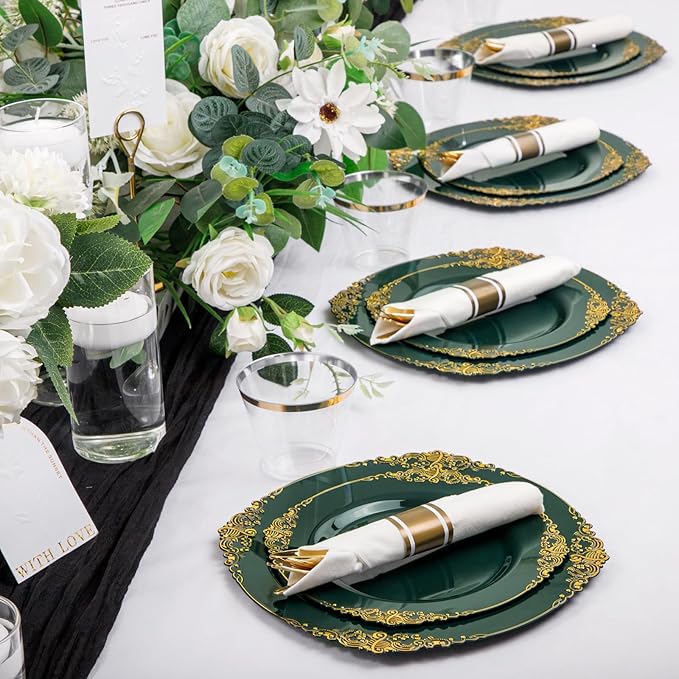 - 25 Guest Set: You can get 25pcs 10.25inch green dinner plates, 25pcs 7.5inch green dessert plates, 25pcs 9oz gold rim plastic cups and 25pcs pre rolled napkins with gold plastic silverware sets