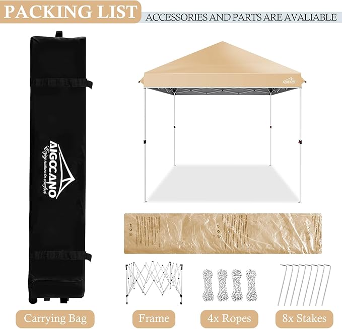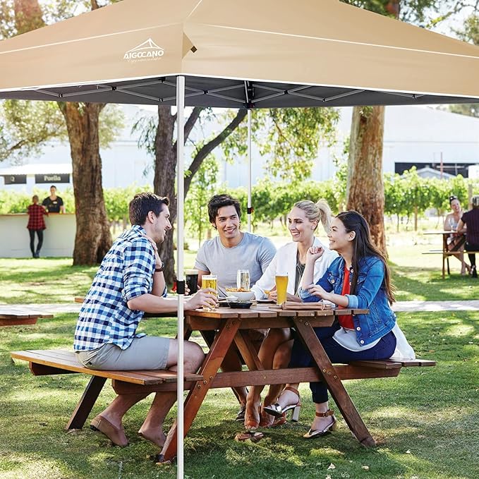 - 【SHADED AREA】AIGOCANO 10x10 pop up canopy provides 100 square feet of shade, and holds 10 people. The tent is 10 X 10 feet with straight legs. You can adjust the height of the canopy by adjusting the button. There are shaded parts to better help you shade.