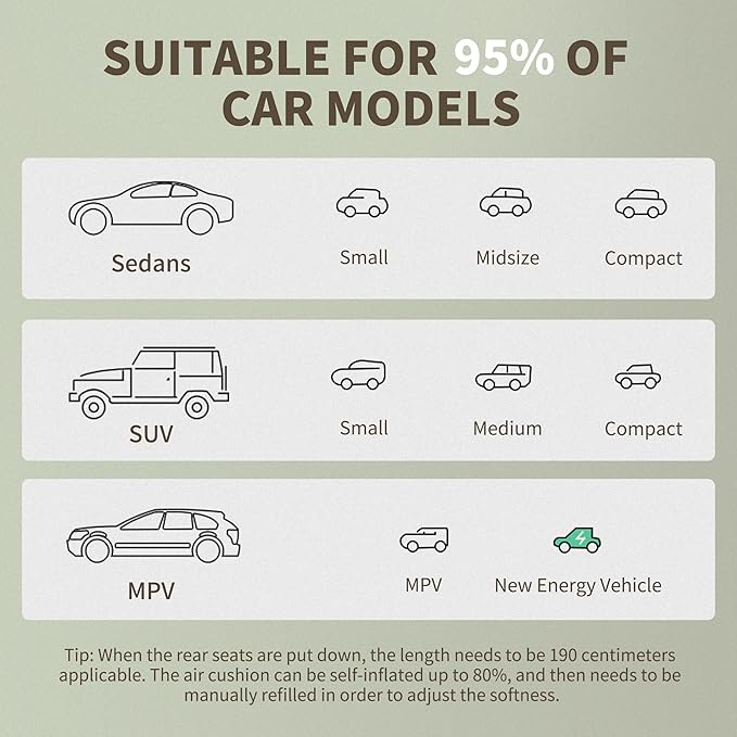 - WIDE RANGE OF USAGE SCENARIOS: The size of the car mattress is 197*134cm/ 77.6*52.8''. You can fold the air mattress after pumping and then roll it up, tie it with a strap and then put it into the storage carry bag. The carry bag can be carried or carried on your back, convenient for you to go to the following scenarios: camping / outdoor / home / travel / car
