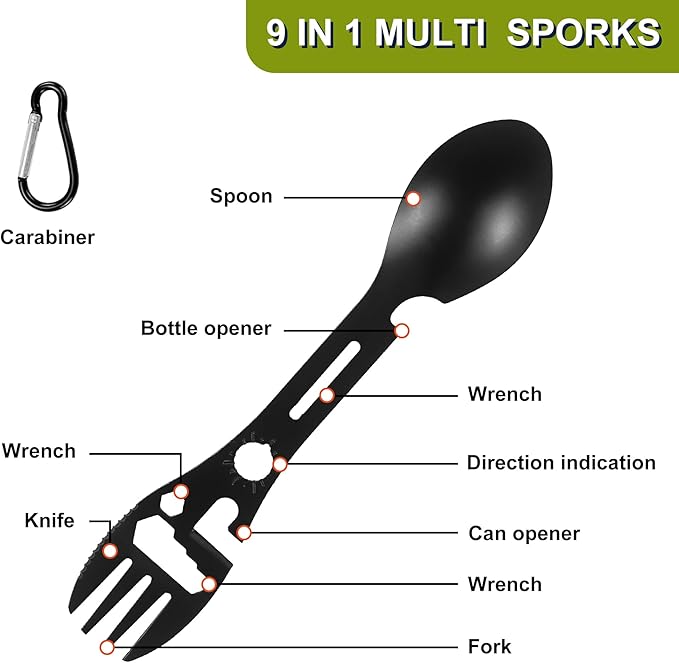 - Multi-functional Camping Sporks - Made of stainless steel, it can be a spoon, fork, bottle opener, can opener, or positioning wrench which will add more functions to your camping travel and feature a hole to attach it to a backpack with a keychain for portability