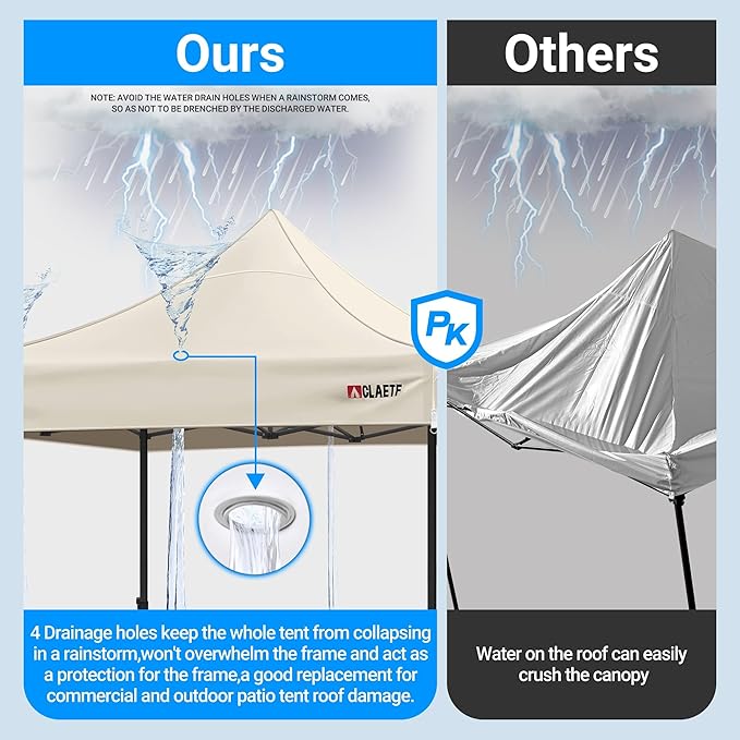 - Let the Rainwater Drain: Upgraded 10x10 canopy features four integrated drainage holes to prevent collapse in heavy rain while maintaining frame stability. Keep a safe distance from drains during downpours to avoid splash. Versatile for various uses: commercial, backyard, camping, trade shows, picnics, etc.