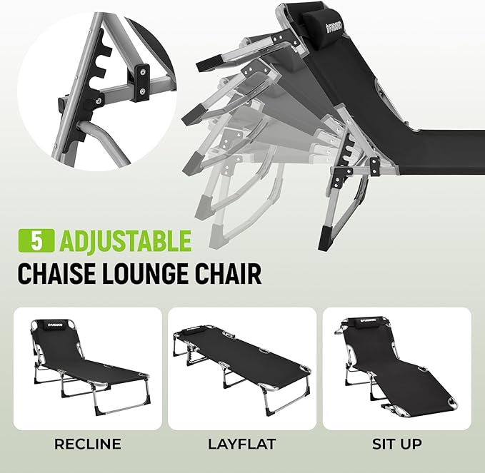 - 5 Adjustable Recline Positions – Choose from five personalized reclining angles to find your ideal comfort—whether you're lying flat for sunbathing, propped up for reading, or sitting upright to chat. The wraparound frame design offers superb support in every position, making it a versatile chaise lounge chair for any outdoor setting.