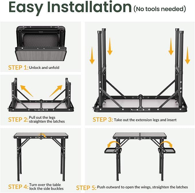 - Simple 5-step Installation (No tools needed). Step 1: Unlock and unfold. Step 2: Pull out the legs and straighten the latches. Step 3: Take out the extension legs and insert. Step 4: Turn over the table and lock the side buckles. Step 5: Push outward to open the wings, straighten the latches. Done. Please refer to the installation steps in the picture.